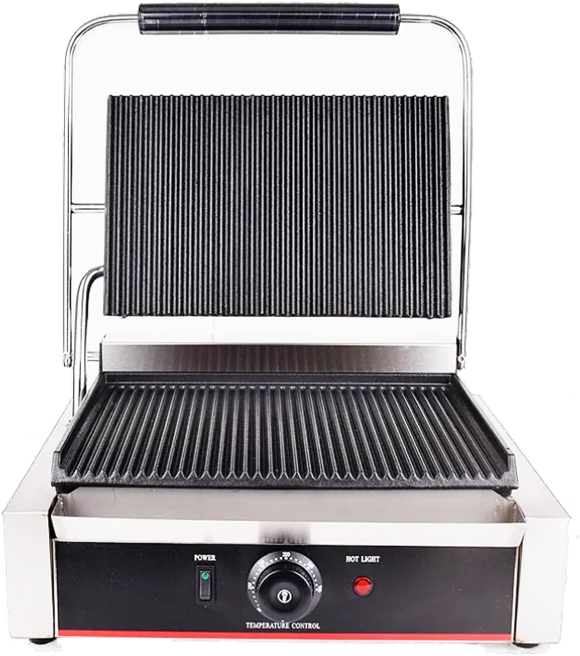 The Panini Grill Ribbed brings professional sandwich grilling to commercial kitchens. This Panini Grill Ribbed uses better heating tubes in top and bottom plates. Superior heating elements ensure even temperature distribution across cooking surfaces. The temperature runs quick and evenly for consistent results. Rapid heating and uniform temperature mean predictable cooking every time. Easy to clean with an oil pan included. Fat and drippings collect in the pan for simple disposal. Automatically cuts off when reaching setting temperature. Energy-saving automatic shutoff prevents unnecessary power consumption. Ribbed plates create attractive grill marks on sandwiches. Professional appearance enhances food presentation for customers. Better heating tubes provide faster heat-up time. Get to cooking temperature quickly during morning preparation.